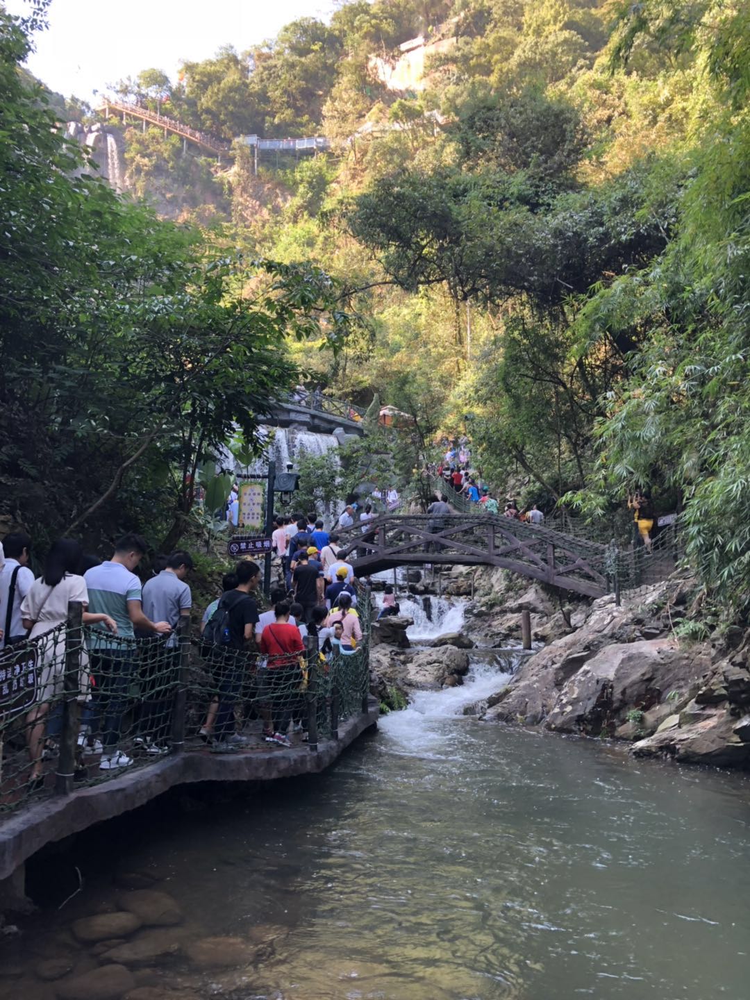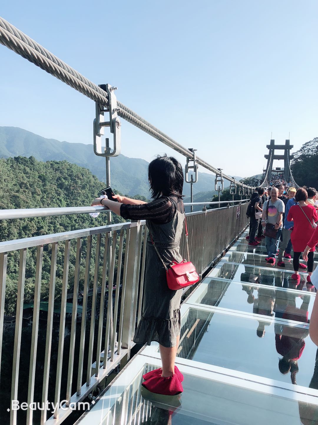 午飯過后,大家繼續(xù)趕往下一景點(diǎn)——古龍峽,早已聽聞古龍峽有一個(gè)長達(dá)三百多米的玻璃吊橋,想著馬上就能一睹風(fēng)光,心里真是又激動(dòng)又害怕。從山下一路上來,來往的人真是數(shù)不勝數(shù),雖然一路走走停停,但正好可以享受沿途的風(fēng)景。一路上拍照留念,很快并到達(dá)玻璃橋的入口,看著橋面上熙熙攘攘的人群,內(nèi)心也不會(huì)感覺到那么害怕了;站在橋面上,微風(fēng)拂面,真正感受到大自然的美好。