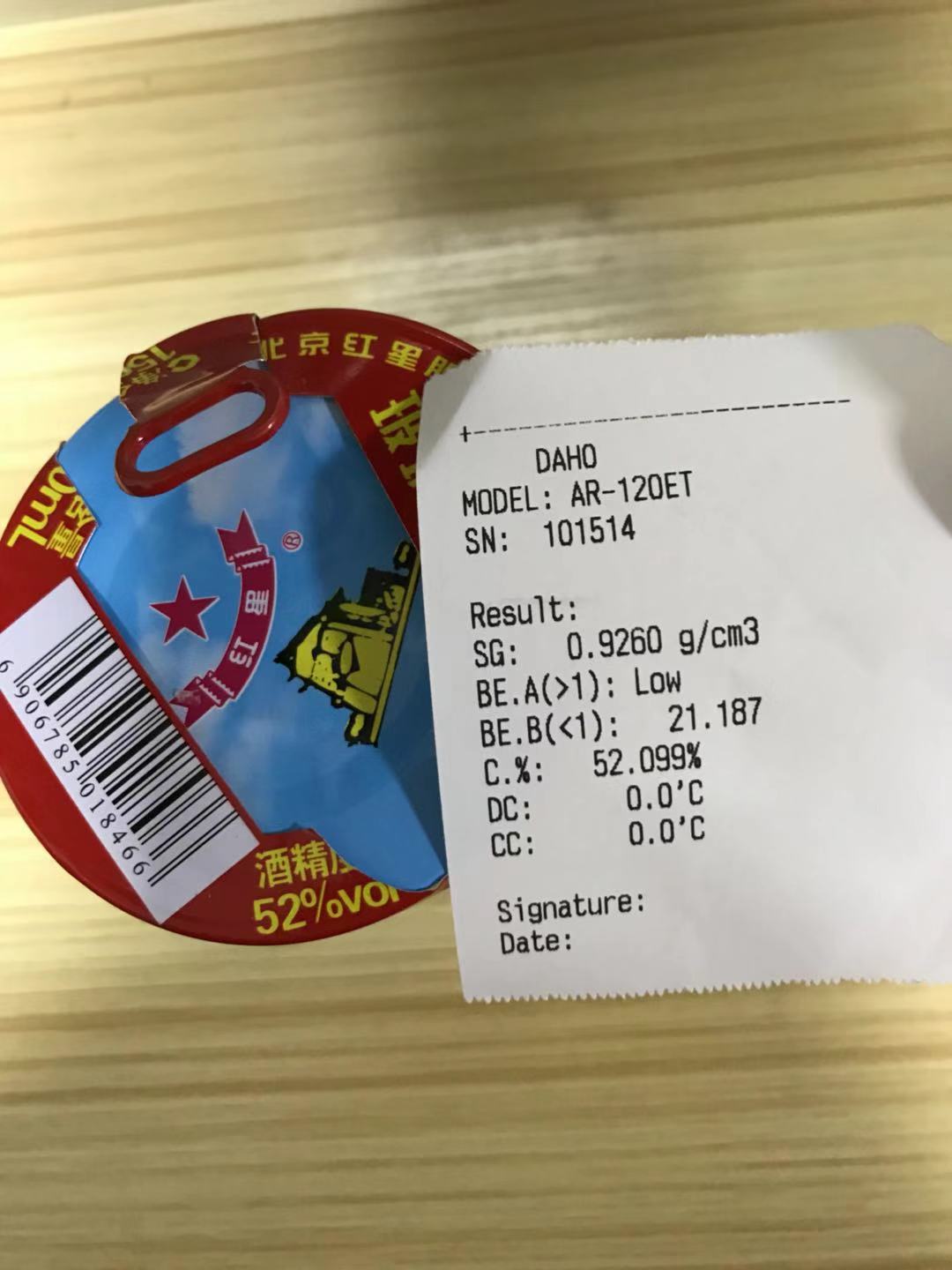 四川的王先生開的一家釀酒廠,需要測試白酒的含量,但以往并未用過我們這種臺式數(shù)顯式的濃度計,擔(dān)心測試不準確。為讓客戶放心,我公司特地買了一瓶白酒(酒精含量52%),并錄制了測試視頻,測試結(jié)果與白酒本身的含量完全一致,再次證明宏拓儀器設(shè)備經(jīng)得起考驗。儀器操作簡單,新手也能輕易操作,需要了解如何操作的,可點此鏈接進行觀看,高精度酒精濃度計的操作視頻:http://www.3depsmachine.com/video_show.asp?id=184