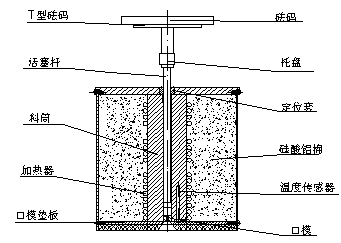 下圖是熔體流動速率儀的結(jié)構(gòu)示意圖。料筒外面包裹的是加熱器,在料筒的底部有一只口模,口模中心是熔體擠壓流出的毛細管。料筒內(nèi)插入一支活塞桿,在桿的頂部壓著砝碼。